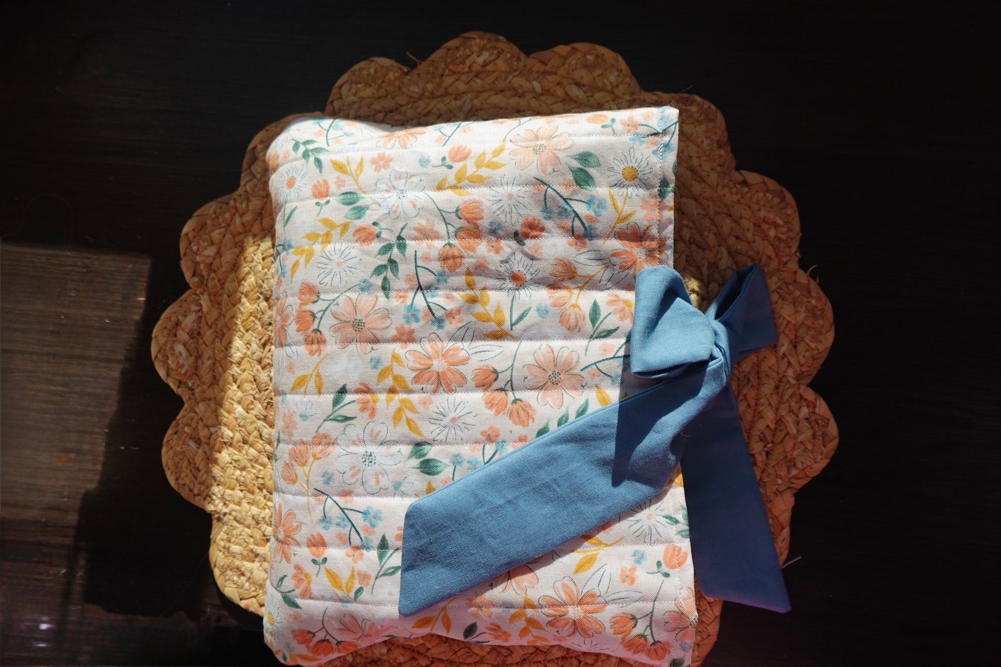 Material & Design: Floral exterior in coral, yellow, and green tones with a soft blue tie, handmade and unique