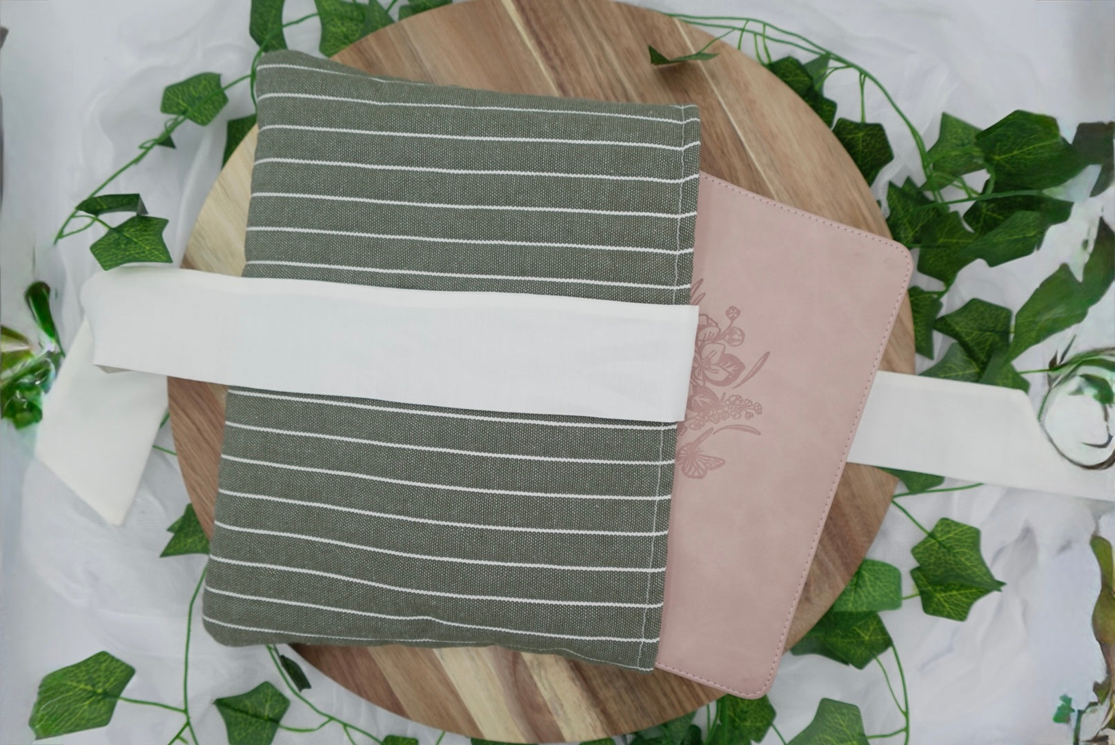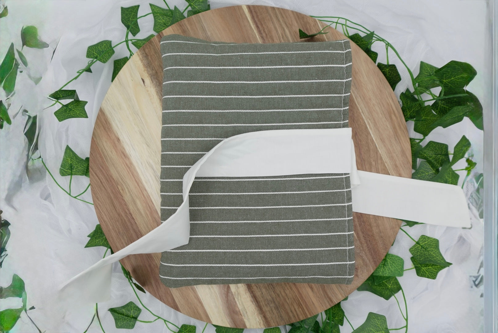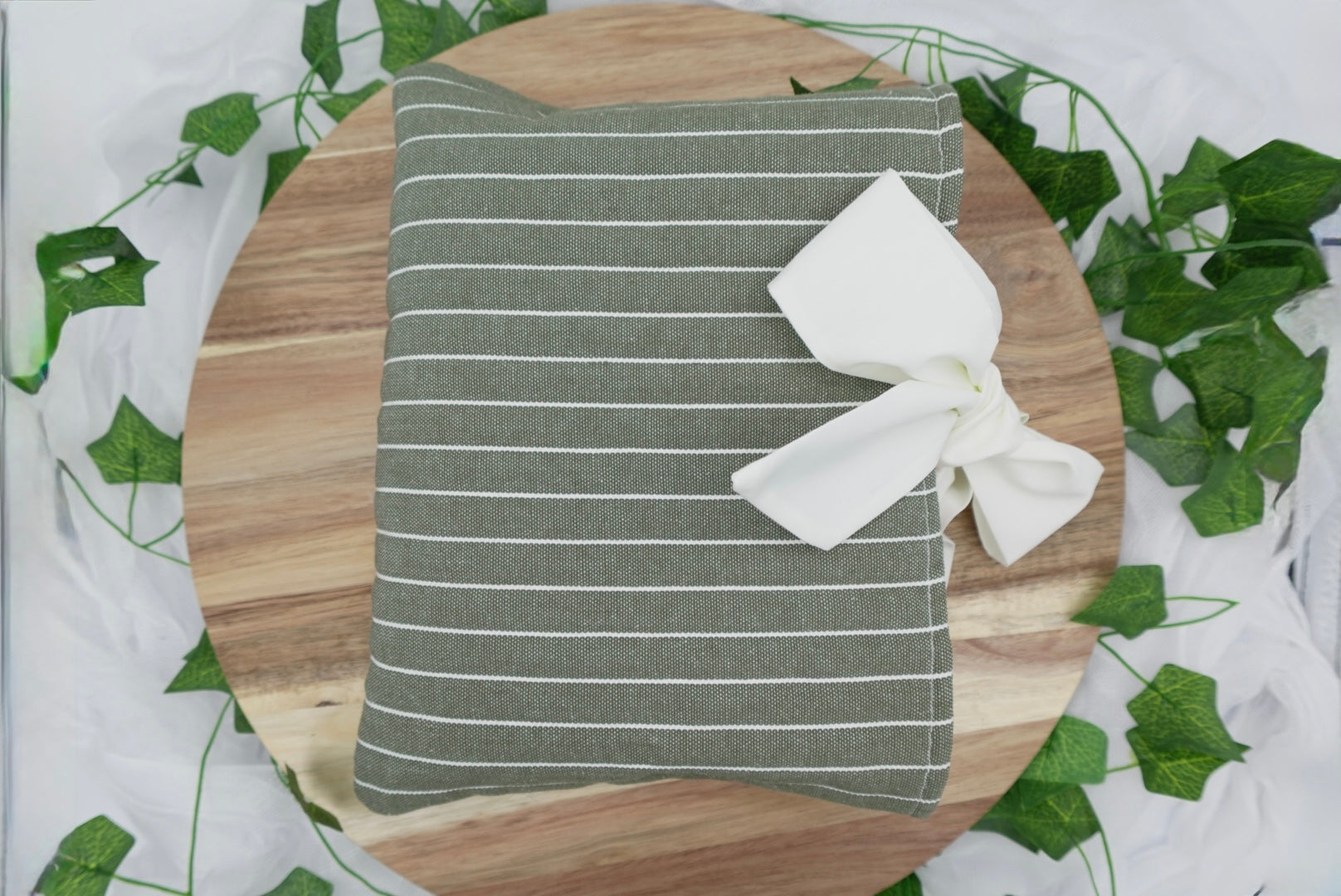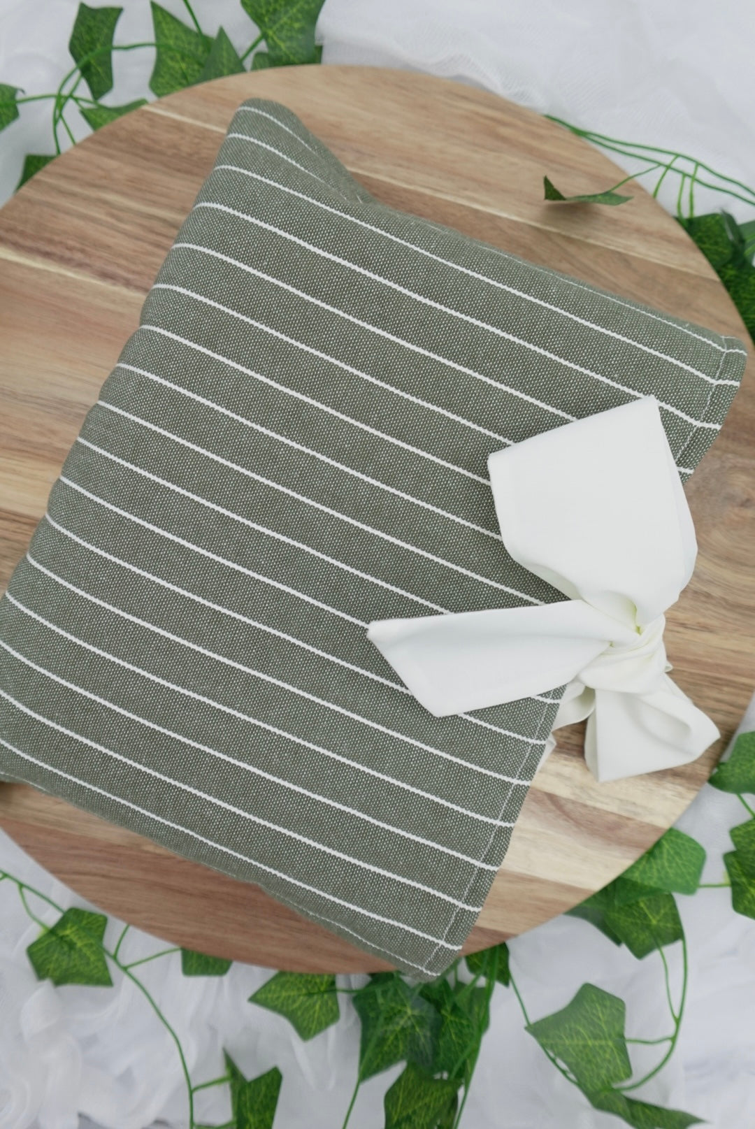 Material & Design: Soft green and white striped fabric with coordinating bow (handmade, unique)